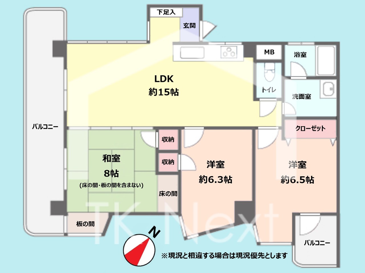 | 間取 | 3LDK (LDK15帖、和室8帖、洋室6.5帖、洋室6.3帖) | ||