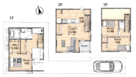 | 間取 | 3LDK + WIC付き! (LDK16.6帖、洋室6帖、洋室5帖、洋室4.5帖) | ||