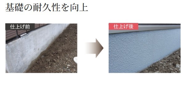 当社が採用する住宅基礎保護システムは、既調合弾性ポリマーセメントモルタルに着色剤を配合した弾性カラーモルタルです。特徴として住宅基礎表面の微細なクラックの発生を軽減し、地面からの水の浸入を抑制することで、長期的に美観を維持します。また汚染を防ぎ、基礎コンクリートの中性化を抑制し、耐久性を向上させます