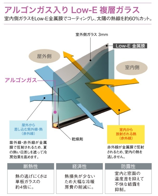 高い断熱クオリティをもつ断熱樹脂サッシは、ハイレベルの断熱性能を実現し、次世代省エネルギー基準に適合します。 Low-E複層ガラスの断熱性能は、単板ガラスの約4倍にも及び、その高い断熱効果から冷暖房費を大幅に節約することができます。