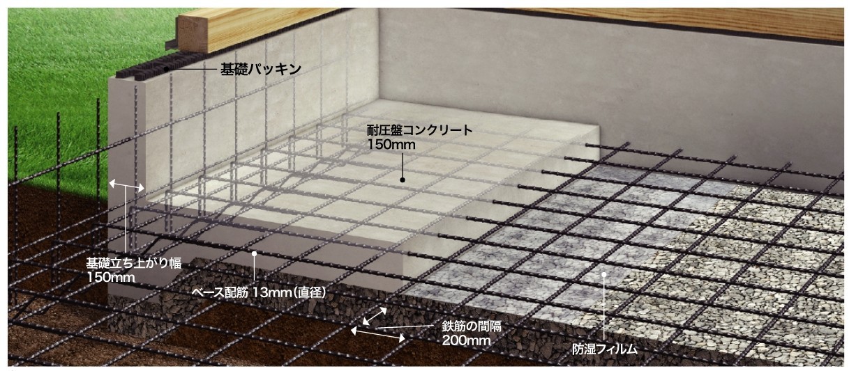 「ベタ基礎」と呼ばれる、建物の底板一面を鉄筋コンクリートで支える基礎(耐圧盤)を採用しています。一般的な「布基礎」と呼ばれる1階の壁下のみに基礎を配置する形と異なり、家の荷重を底板全体で受け止め建物を支えるため、負荷が分散され安定性に優れます。耐圧盤コンクリートは150mm厚で不等沈下を抑制します。