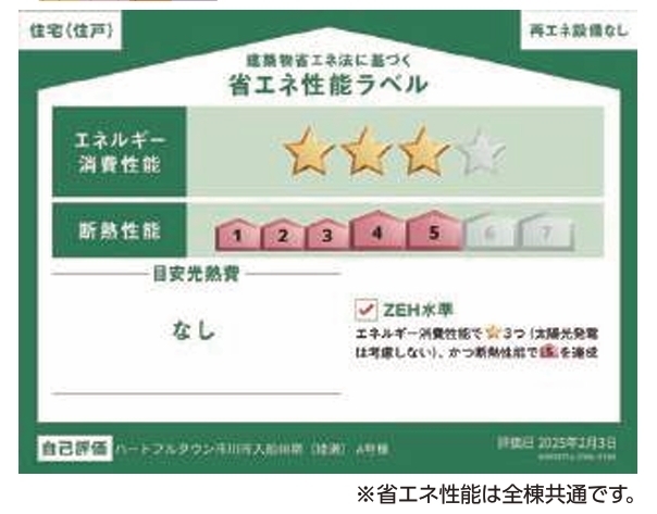 | 省エネ性能表示 | エネルギー消費性能:★★★~★★★ 断熱性能:5段階~5段階 |