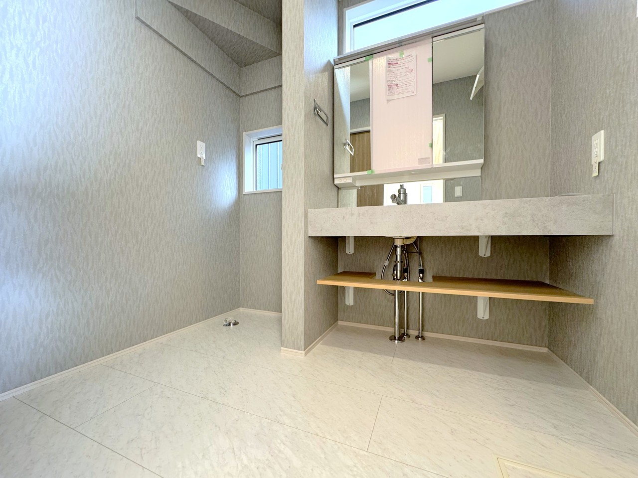 トップボード広め、両サイド収納の洗面台で、二人同時の身支度もスムーズ♪