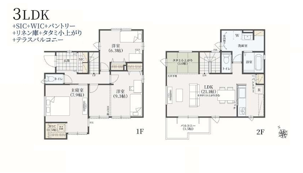 | 間取 | 3SLDK (洋室9.3帖、洋室7.9帖、洋室6.3帖、LDK21.1帖) | ||