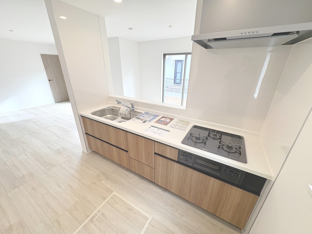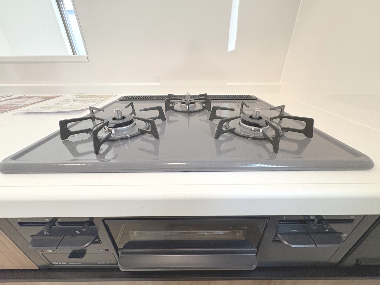 3口のガスコンロ。同時進行で調理が行え、料理の時間を節約できます