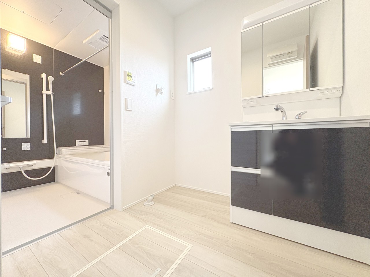 シャワー付きで機能的な3面鏡洗面台