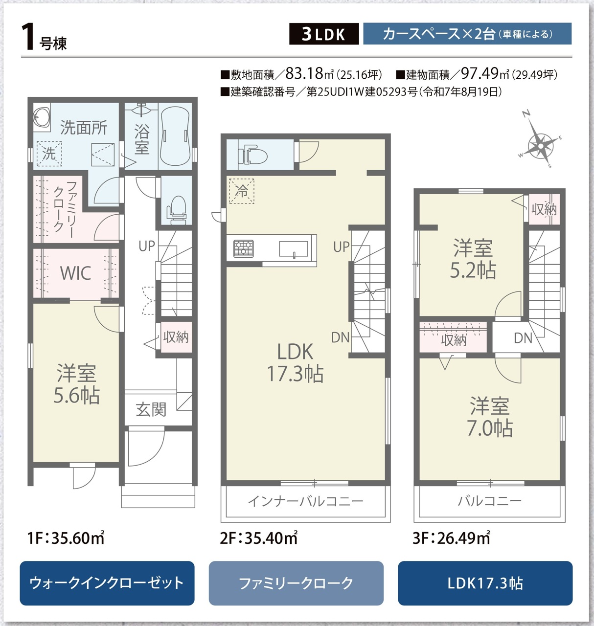 | 間取 | 3LDK + ファミリークロークあり (LDK17.3帖、洋室7帖、洋室5.6帖、洋室5.2帖) | ||