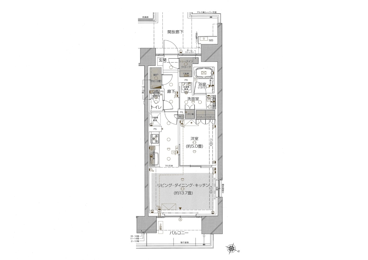 | 間取 | 1SLDK (LDK13.7帖、洋室5帖、S0.9帖) | ||