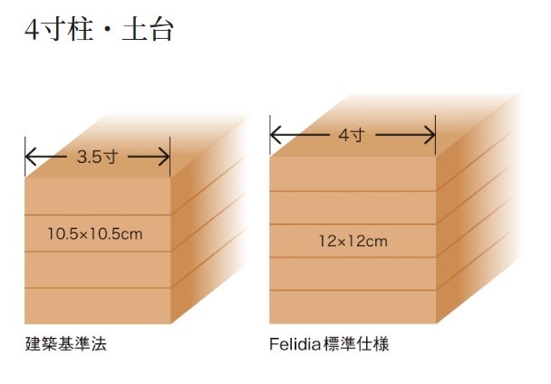 メーターモジュールの建物に4寸角の柱・土台を標準仕様としています。建築基準法に定められた3.5寸角と比べて、4寸角は約1.3倍の断面積で強度がアップします。さらに柱が太くなることによって、万が一の火事の場合でも柱の内部まで火が到達するのに時間を要するため、耐火性も向上します。