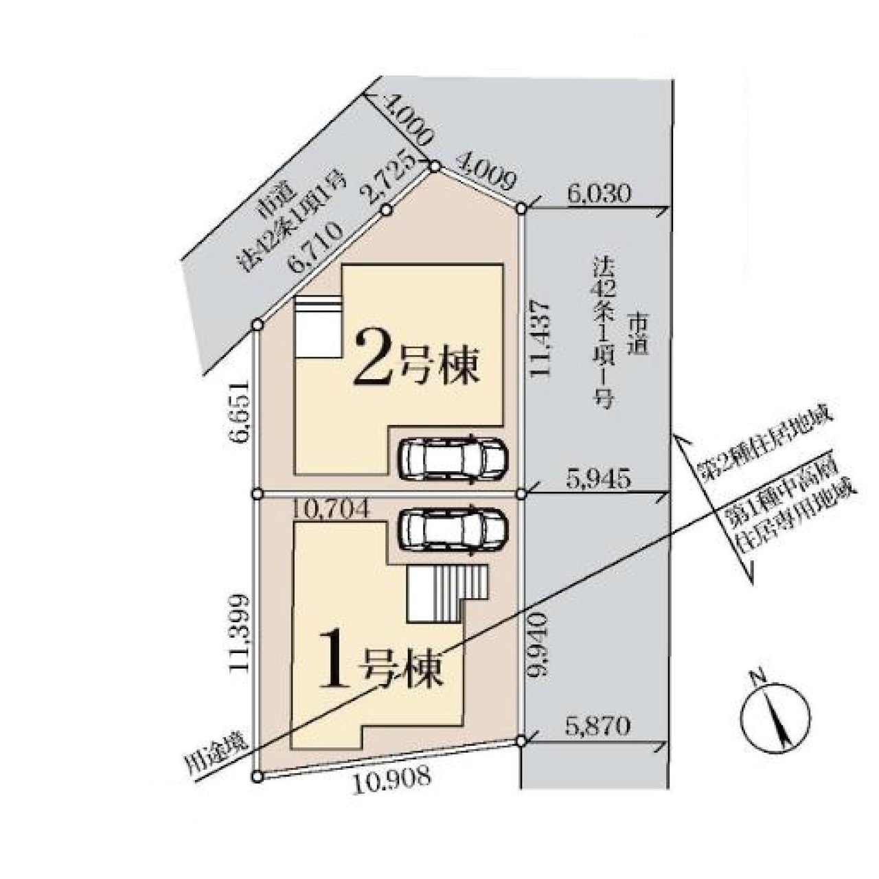| 用途地域 | 第一種中高層住居専用地域/第二種住居地域 | 建ぺい率 | 60% |