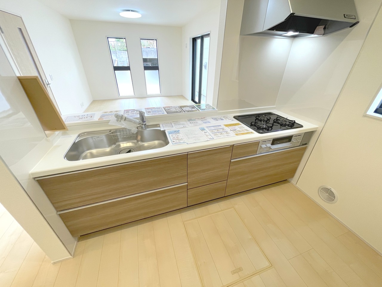 キッチンパネル キッチンの表面は水はねや汚れからガードするパネルタイプの壁材を採用。目地が少なく、汚れの拭き取りが簡単です。国土交通大臣認定の防火材料で、熱にも強い。
