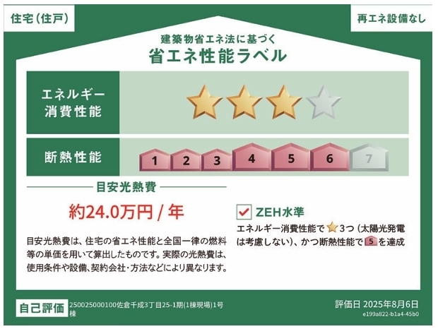 | 省エネ性能表示 | エネルギー消費性能:★★★ 断熱性能:6段階 目安光熱費:約24万円/年 |