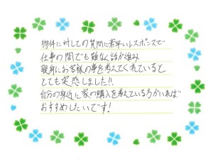 ご担当していただいた遠藤さんにはご丁寧に物件の説明をしていただいて、安心して物件購入が出来ました。