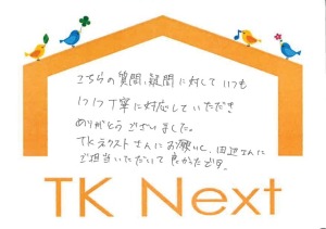 こちらの質問、疑問に対して、いつも1つ1つ丁寧に対応していただき、ありがとうございました。TKネクストさんにお願いし、田辺さんにご担当いただいてよかったです。