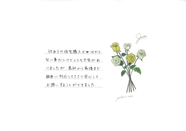 この度は、数ある不動産会社の中から弊社をお選びいただきまして、誠にありがとうございました。様々な不安のある住宅購入に関してご安心いただけたとのお言葉をいただき、嬉しい限りです。N様ご夫妻にいただきましたお言葉を励みとし、今後もよりお客様にご満足いただける接客サービスの向上に努めて参りますので、何かお困りのことがございましたら遠慮なくご相談くださいませ。引き続き末永いお付き合いの程、宜しくお願いいたします。