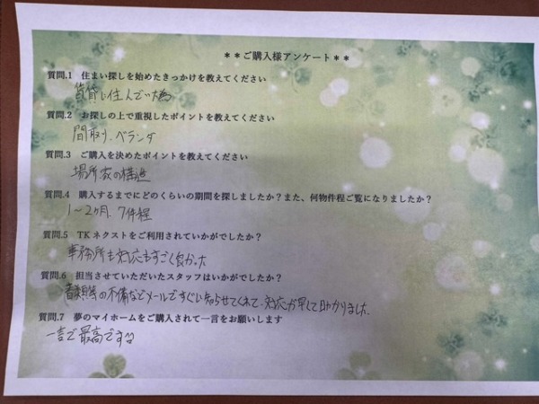 ホームお客様の声八千代支店藤倉様 藤倉様 Vol.22藤倉様 八千代支店 ご成約 藤倉様 一言で最高です 八千代支店 担当 安藤 順一 ご新居前 担当者より 八千代支店安藤 順一 藤倉 様 この度は、対応の早さにつきまして温かいお言葉をいただき、誠にありがとうございました。 藤倉様の大切なお住まい探しをお手伝いさせていただけましたこと、心より光栄に存じます。 このスタッフが担当した他のお客様の声 Vol.64 八千代支店 K様 八千代市 新築戸建てご成約 K様 親身になって対応していただけたので無事マイホームを持つことができました。 ありがとうございました。 担当 安藤 順一 Vol.10 八千代支店 S様 八千代市八千代台北新築戸建ご成約 S様 一生に一度の住宅購入でした。分からないことも親切に対応して下さり、素早い対応をして下さったりとこちらの都合で代行できる事も快くして下さり大変助かりました。ありがとうございました。 担当 安藤 順一 千葉市花見川区 ご成約 U様八千代市八千代台北新築戸建ご成約 S様 一覧にもどる