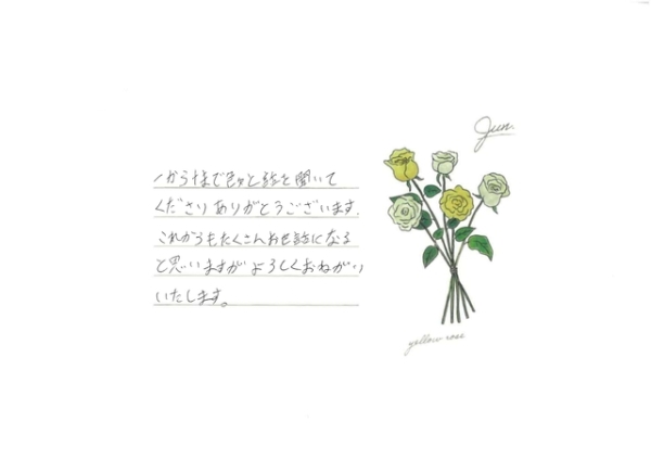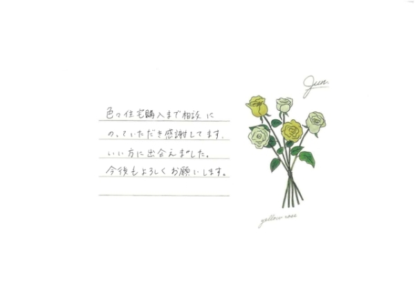 ご多忙の中、アンケートへのご回答ありがとうございます。 また、数ある不動産会社の中から当店をお選びいただき誠にありがとうございました。 人生において大切なお買い物となるH様のお住まい購入に携わる事ができ大変嬉しく思っております。少しでも疑問に思われる事や確認事項がございましたら、いつでもご連絡くださいませ。引き続き末永いお付き合いの程、宜しくお願いいたします。