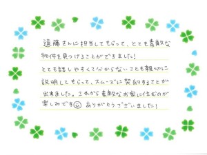 ご担当していただいた遠藤さんにはご丁寧に物件の説明をしていただいて、安心して物件購入が出来ました。