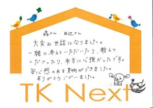 この度は数ある不動産会社の中から弊社をお選び頂き誠にありがとうございました。 又、お忙しい中ご協力に感謝のお言葉頂き重ねて御礼申し上げます。 お住まいになられてからも些細なことでも遠慮なくお尋ね下さいませ。 ご購入迄に色々なストーリーがございましたが無事お引き渡しが出来て何よりです。 お子様の健やかな成長と楽しい会話のある生活を願っております。