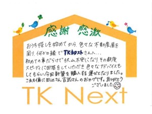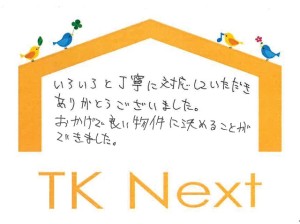おうち探しを始めてから、色々な不動産屋を周り、何かの縁でTKネクストさんへ。。。初めての事だらけで沢山不安になり、その都度スピーディに回答をしていただき、色々なアドバイスもしてもらい、今回、新築を購入する運びとなりました。これも偏に田辺さん、吉武さんのおかげです。ありがとうございました!