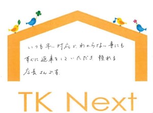 こちらの質問、疑問に対して、いつも1つ1つ丁寧に対応していただき、ありがとうございました。TKネクストさんにお願いし、田辺さんにご担当いただいてよかったです。